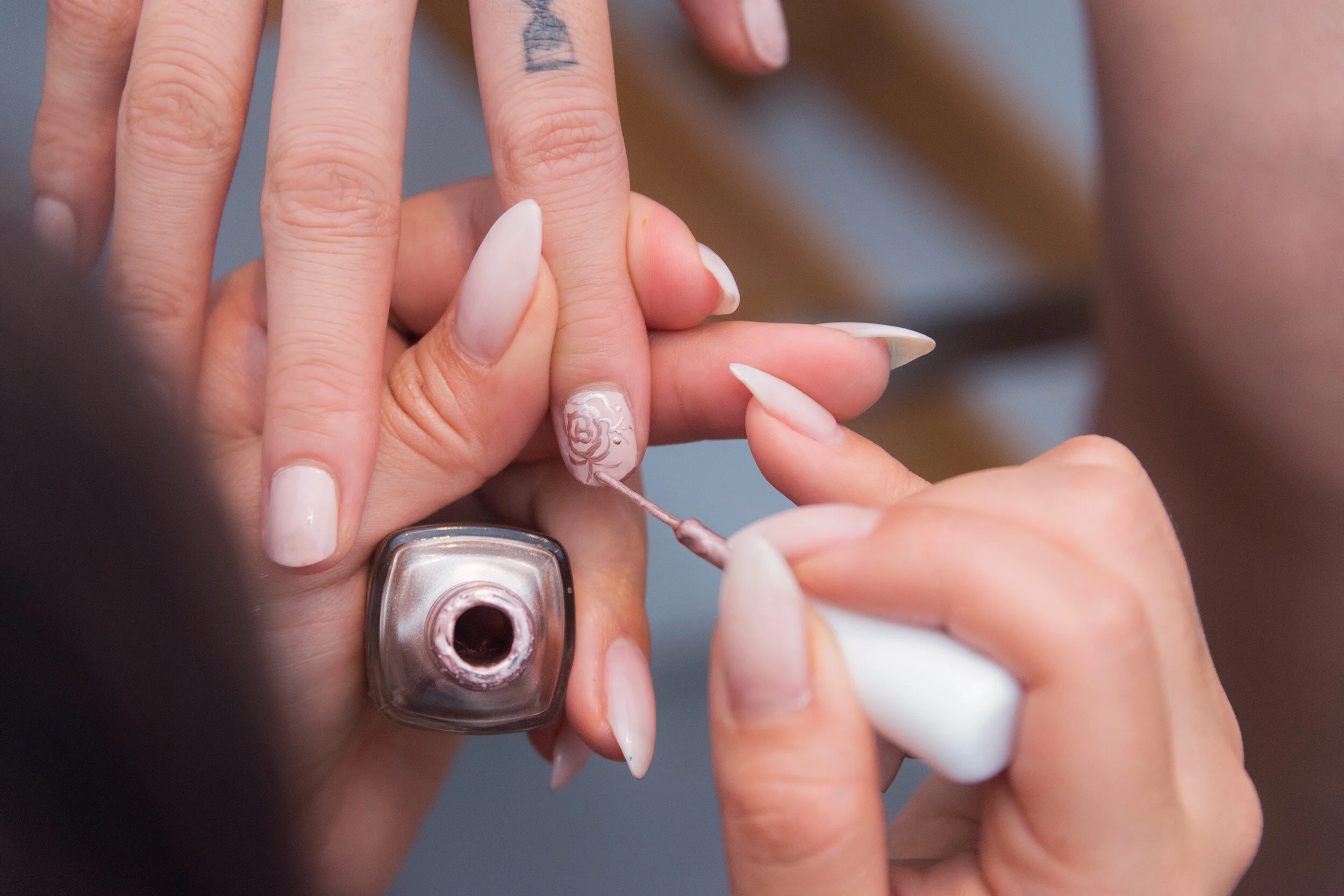 For the Bridal nail, Michael sketched a rose in my sketch book and I then replicated it in polish on both index fingers. I used Essie “Topless and Barefoot” as the perfect "pinkened nude", and the rose was drawn with metallic copper “Penny Talk”. If you haven’t tried nude and copper together yet, its a MUST!