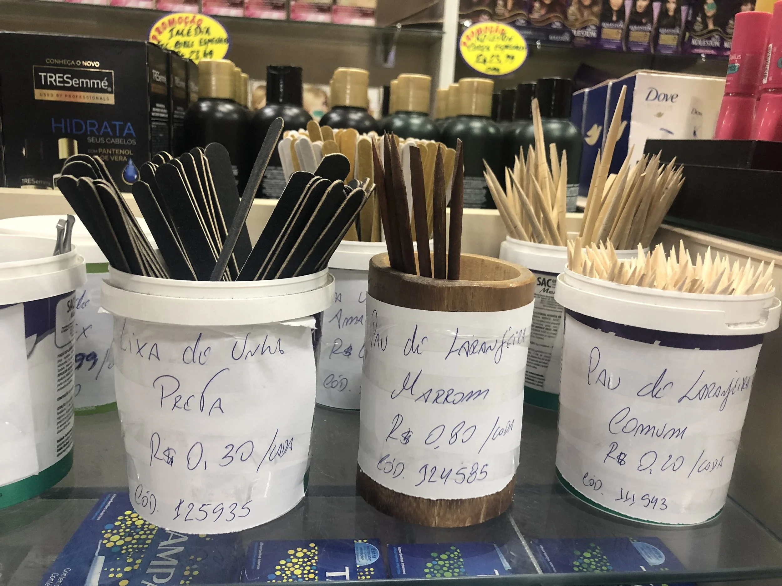 The cuticle sticks in the center are .80 reais - or 20 cents USD. The cheaper, disposable ones on the right are .20 reais - or 5 cents each.