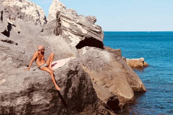 Getting that “insta-worthy” shot from high above the town was my second priority, but that was not going to happen in the hour we had left. I figured my best bet for snapping a pic of me with the cutie pastel houses in the background was to head north towards the bigger beach I saw as we were docking and hope for the best. Our time was winding down quickly and the temps were rising even faster. Finally I managed to grab a shot on some seriously slippery boulders with the pastel houses in the background, from near the beach Bagni Fegina.